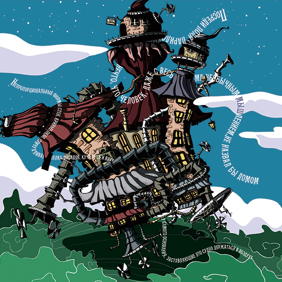 Откуда в моей голове взялось это? Посреди поля, окружённого со всех сторон разноцветными лентами, парило нечто, что человек, даже с весьма необычным мышлением, не назвал бы домом или самолётом. Непропорциональные формы стен, кривые окна, причудливая отделка фасадов, куча труб и винты у самого основания, заставляющие это судно держаться в воздухе.