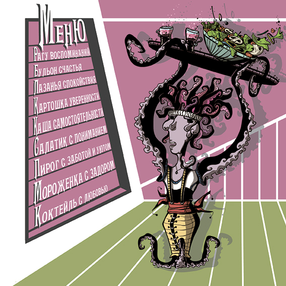 Мы приземлились на деревянные лавочки, устланные мягкими, с вышитыми узорами по краям, подушками. Трактир оживился быстрее, чем мы увидели меню. Кто- то из гостей напевал песни с весёлыми мотивами. От столика к столику перемещались официанты, но чудные в своём роде, похожие на маленьких осьминогов. Множество щупалец держали подносы, жонглируя едой, словно шариками. И один такой огромный поднос на голове этого существа с лёгкостью приземлился к нам на стол.