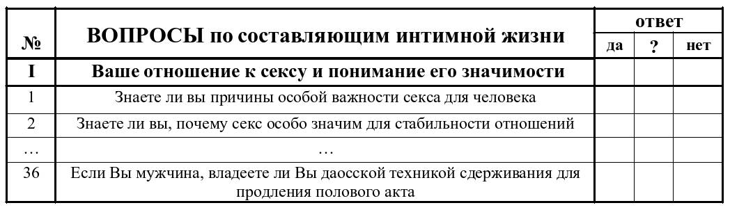 Не удивляйтесь, если какие-то вопросы покажутся вам «необычными». Они специально составлены таким образом, чтобы, во-первых, охватить сферу сексуальности шире, а, во-вторых, помочь вам избавиться от рутинного восприятия интимной жизни. Отвечая на них, старайтесь быть максимально искренними, ведь их задача – подтолкнуть вас к размышлениям. В случае сомнений, ставьте галочку в столбце, помеченном вопросительным знаком (?).