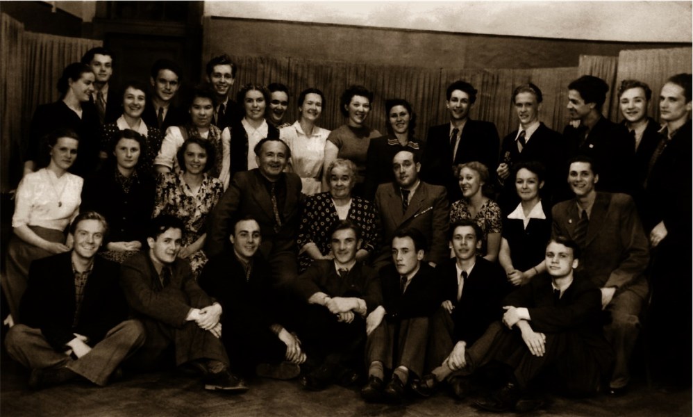 Ольга Леонардовна Книппер-Чехова, Александр Михайлович Карев, ректор Школы-студии МХАТ Вениамин Захарович Радомысленский со студентами. В верхнем ряду: крайний справа – Петр Фоменко, пятый справа – Игорь Кваша, девятая справа – Галина Волчек