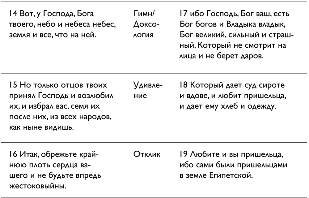 И вновь мы находим комментарий рассматриваемых нами событий в Книге Второзаконие. Во Втор. 10, 14–19 вселенское царство Яхве упоминается, как это ни парадоксально, одновременно с глубоко индивидуальным состраданием. Этот отрывок имеет форму гимна с двумя параллельными частями, по три стиха в каждой. Первый стих каждой части (ст. 14, 17) – хвалебное восклицание. Второй (ст. 15, 18) выражает удивление. И, наконец, третий (ст. 16, 19) представляет собой практический и этический отклик, ожидаемый от Израиля в ответ на только что прозвучавшие утверждения (см. таблицу 3.1).