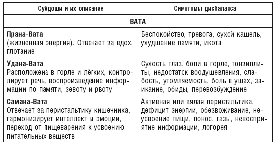 Симптомами дисбаланса Ваты является грубая, сухая кожа, недостаточный вес, боли, беспокойство, нетерпеливость, тревожность, запоры, боли в суставах, слабость, отсутствие концентрации, бессонница, скудные, болезненные менструации.
