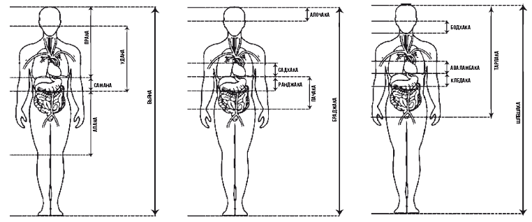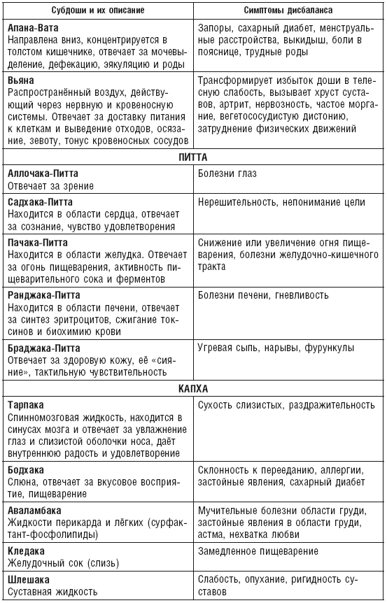 И далее поговорим о шести вкусах. В Аюрведе выделяют сладкий, кислый, солёный, острый, горький и вяжущий вкусы. Каждый вкус состоит из двух элементов (рис. с. 13). Аюрведическая теория вкусов помогает понять, почему мы становимся тем, что мы едим. Вкус является для тела тем же, чем являются эмоции для ума. Ощущение вкуса на языке вызывает определённые эмоции. На теории шести вкусов базируется вся ведическая фитотерапия и диетология. Сладкий вкус состоит из элементов Земля и Вода. По своим качествам он тяжёл, холоден и маслянист. Кислый вкус (Земля и Огонь) тяжёл, горяч и маслянист. Солёный вкус состоит из элементов Вода и Огонь. Он тяжёлый, согревает (насыпь соли в ранку, и всё поймёшь), увлажняет. Острый вкус состоит из элементов Огонь и Воздух. По своим качествам он лёгкий и сухой, оказывает согревающее действие. Горький вкус состоит из элементов Воздух и Эфир, он лёгкий и сухой, оказывает охлаждающее действие. И наконец, вяжущий вкус состоит из элементов Воздух и Земля. В небольших количествах он уменьшает секреторные выделения, укрепляет и очищает ткани тела. При избытке он подавляет деятельность секреторных желез и сушит ткани, что вызывает запоры.