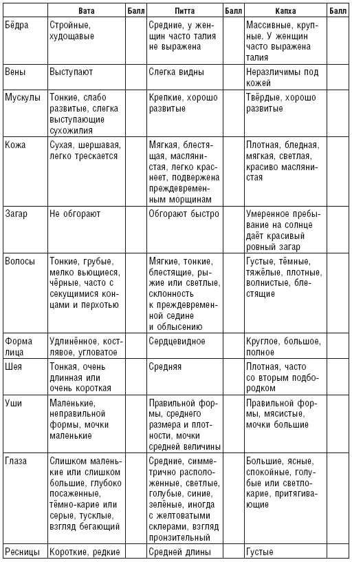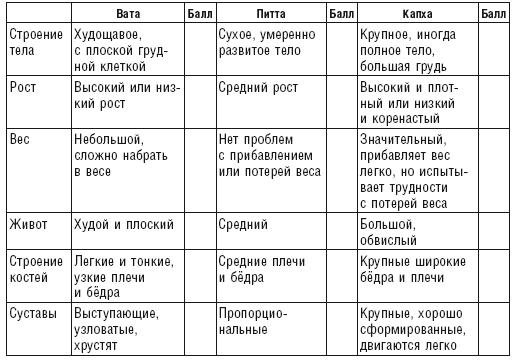 Заполни каждый раздел и подсчитай общую сумму, чтобы заполнить количество баллов для каждой доши. Учитывай характерные симптомы за последние пять лет, а не за последний месяц. В результате проделанной работы ты сможешь подобрать диету и образ жизни для себя согласно рекомендациям Аюрведы.