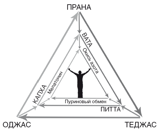 Согласно современным научным исследованиям, регуляция функций организма Вата-дошей совершается при помощи окиси азота (N0). Дисбаланс Ваты выражается в дефиците синтеза N0 – важнейшего фактора-регулятора сосудистого тонуса, что приводит к спазму сосудов и развитию артериальной гипертонии, самой частой болезни нашего времени. Помимо этого нехватка N0 приводит к повышению уровня холестерина, нарушению костной ткани, тромбозам. Пуриновый обмен регулирует функции Питта-доши в организме. При его нарушении падает уровень обновления нуклеиновых кислот и белков в организме, ухудшается энергетический метаболизм. При нарушении распада пуриновых нуклеотидов накапливается мочевая кислота, вызывающая подагру и прочие болезни. И наконец, Капха-дошей «занимается» гормон мелатонин. Это крайне важный гормон, который регулирует деятельность эндокринной и иммунной системы, кровяное давление, замедляет процессы старения и отвечает за адаптацию при смене часовых поясов.