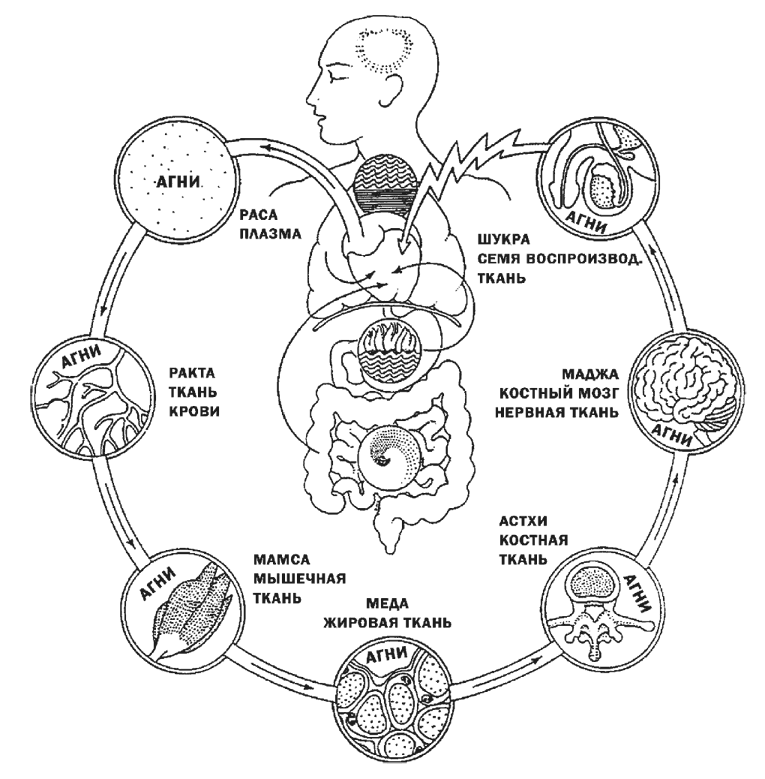 Когда процесс переваривания пищи подошёл к концу, из питательного хилуса начинается формирование тканей организма. Согласно Аюрведе, человеческий организм состоит из семи дхату (тканей).