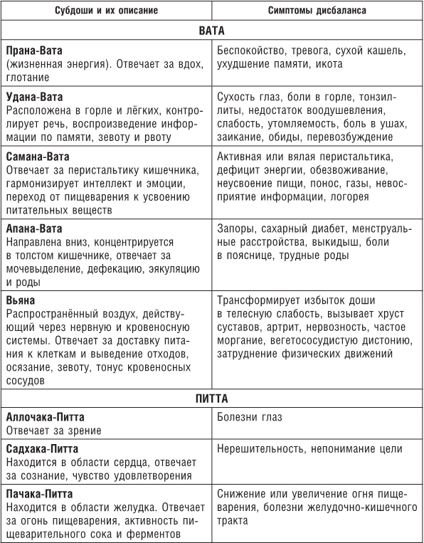 Симптомами дисбаланса Ваты является грубая, сухая кожа, недостаточный вес, боли, беспокойство, нетерпеливость, тревожность, запоры, боли в суставах, слабость, отсутствие концентрации, бессонница, скудные, болезненные менструации.