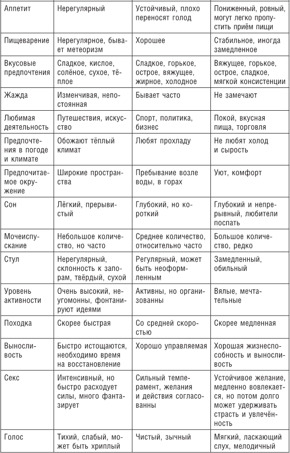 Ватам обычно трудно эффективно работать, если они не позавтракали, и ближе к полудню они начинают ощущать тревогу или сонливость. Многие люди этого типа замечают, что пища в них быстро «перегорает», а потому стараются завтракать плотно, но большинство чувствуют себя лучше, имея лёгкий завтрак, а затем ранний обед или перекус перед обедом. Люди Питта-типа могут при необходимости и пропустить завтрак, особенно если преследуют какую-то цель, но ко времени обеда становятся вспыльчивыми и по-настоящему успокаиваются, только хорошо поев. Иногда, если они слишком долго ничего не ели, их мучит изжога. Они увлекаются стимуляторами и могут злоупотреблять кофе и чаем – как по утрам, чтобы стряхнуть остатки сна, так и в течение дня, чтобы поддерживать высокий уровень энергетических затрат. Сословие Капха-типа лучше всего чувствует себя после лёгкого завтрака – например, съев какой-нибудь фрукт, а иногда рады и вовсе пропустить завтрак. Обычно они не слишком огорчаются, пропустив даже и обед. В силу их природы стимуляторы их не привлекают, но утром они могут насладиться чашечкой кофе или чая, чтобы помочь себе мобилизоваться.