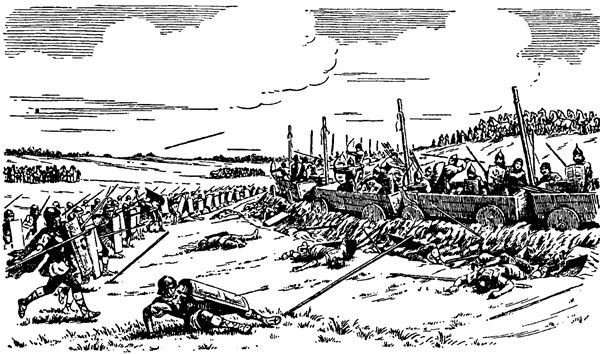 Лагерь славяне обычно разбивали на высоте, к которой не было скрытых подступов. При необходимости дать бой на открытом поле они устраивали укрепление из повозок. Феофилакт Симокатт сообщает о походе одного славянского отряда, который вел бой с римлянами: «Так как это столкновение для варваров (славян) было неизбежным (и не предвещало успеха), то они, составив повозки, устроили из них как бы укрепление лагеря и в середину этого лагеря поместили женщин и детей»[25]. Славяне связали повозки, и получилось сомкнутое укрепление, с которого они метали копья в противника. Укрепление из повозок было надежной защитой от конницы.