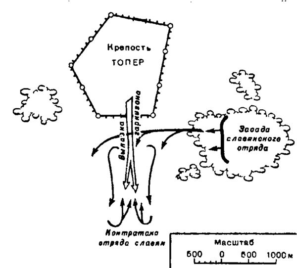 Так был уничтожен гарнизон Топера. Этот эпизод свидетельствует о хорошей организации взаимодействия двух славянских отрядов, атаковавших римлян с фронта и с тыла. Римский же военачальник, не имея сведений о противнике, решился на общую вылазку силами всего гарнизона, не обеспечив ее ни выделением резерва, ни организацией разведки и охранения.
