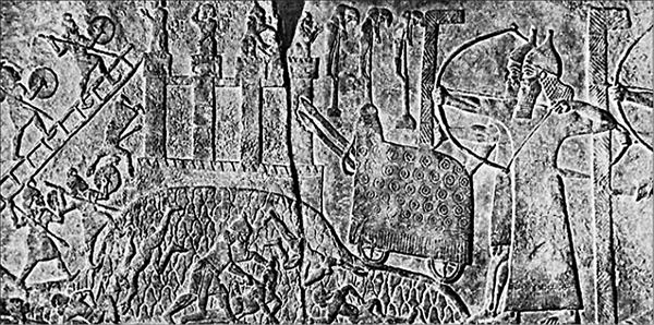 Ассирийские войска осаждают город с использованием штурмовых лестниц и тарана