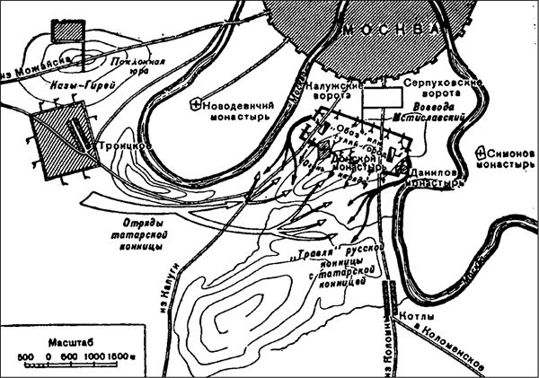 Борис Годунов приказал отправить воеводам всех полков новое приказание – быстро идти к Москве для ее защиты от врага. 1 июля полки сосредоточились в районе села Коломенского. К этому времени заканчивалась установка гуляй-города во входящей к Кремлю излучине р. Москвы против Данилова монастыря. Ширина излучины достигала здесь трех километров, а длина от Данилова монастыря до Кремля – около четырех километров. Место для расположения этого оборонительного сооружения воеводы выбрали весьма удачно: фланги его прикрывала река Москва (шириной в этих пунктах до 400 м); в тылу находился Кремль. Противник лишался самого удобного подступа к Кремлю, где успешно могла действовать его конница; расположенная в гуляй-городе рать угрожала тылу вражеского войска.