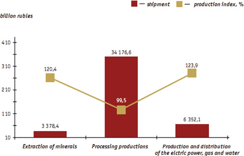 In 2007 the volume of the shipped goods of own production, executed works and services according to the types of economic activities, extraction of the minerals, processing industries, production and distribution of the electric power, gas and water constituted 538.1 billion rubles. In comparison with 2006 it reached 104.4 %. In 2007 the rating of the Krai among the Russian Federation’s subjects, arranged according to physical volume index, improved. The Krai moved from the 68th (in 2006) to the 57th place (in 2007).