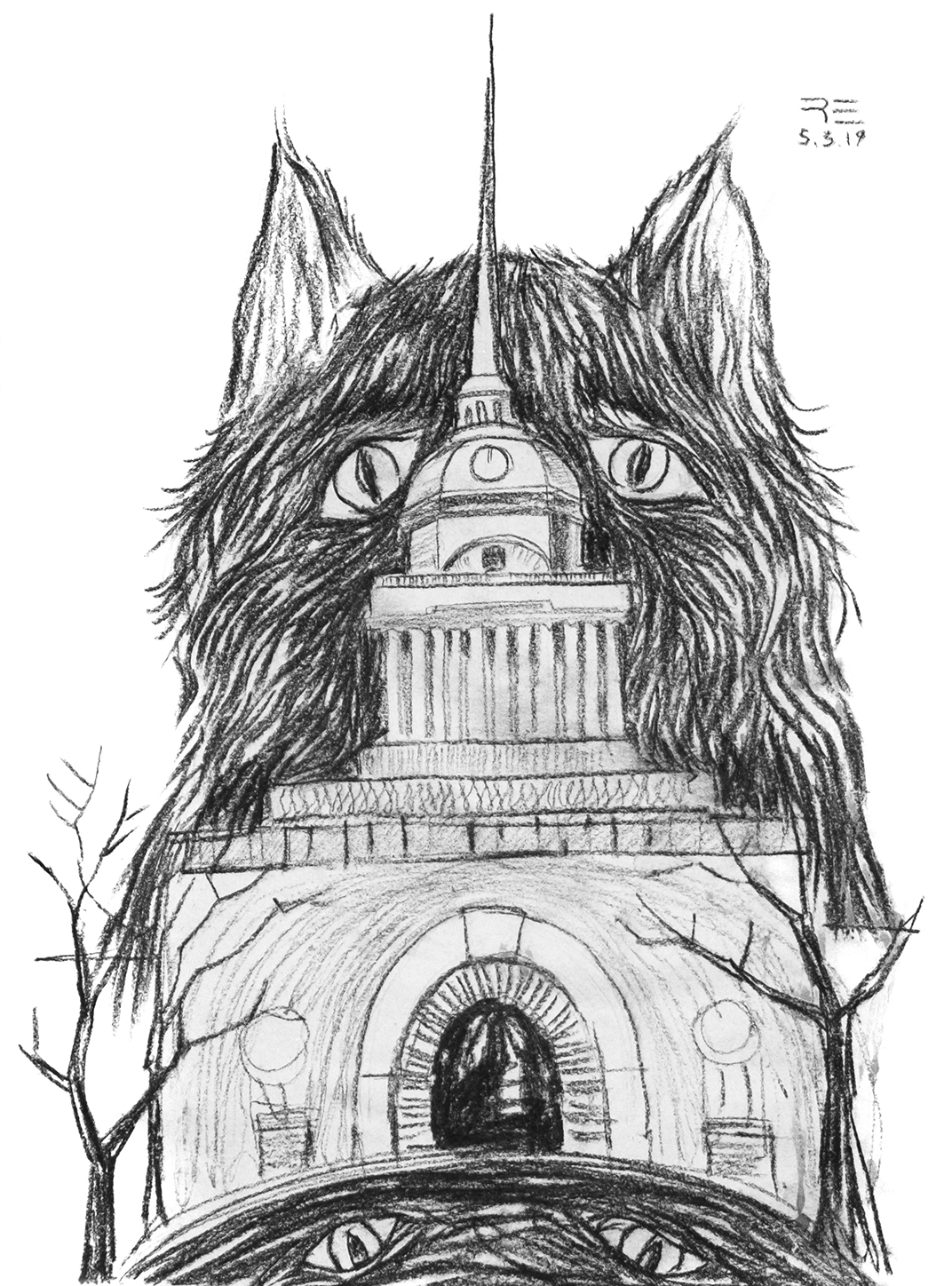 Лазурная даль рисовала силуэт лодочки с сидящими в ней двумя фигурами. Одна высокая, с гнездом пружин на голове, вторая пониже, с треугольными ушами. От высокого силуэта периодически отходил прозрачный сигарный дымок. Позже идиллия равновесия нарушилась. Лодка стала крениться в сторону ушастой фигуры. Кот Тимофей рыбалил лапой и каждые полминуты вынимал из океана рыбку, которую тут же съедал. После нескольких часов такого времяпрепровождения его фигура начала стремиться к шару.