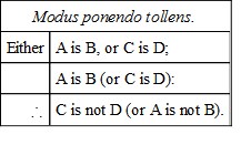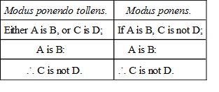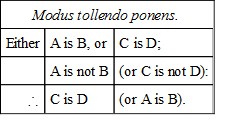 Similarly the Modus ponendo tollens is equivalent to that kind of Modus ponens which may be formed with a negative major premise; for if the alternatives of a disjunctive proposition be exclusive, the corresponding hypothetical be affirmative or negative: