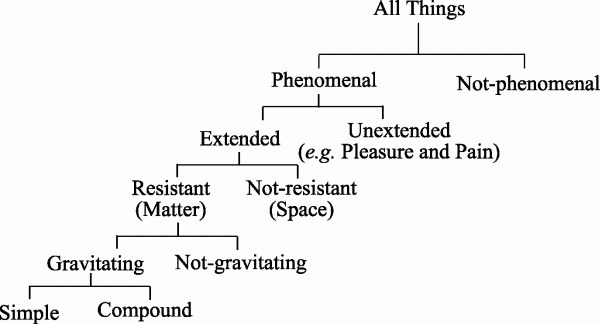 Having subdivided 'Simple' by all possible characters, we must then go back and similarly subdivide Not-phenomenal, Unextended, Not-resistant, Not-gravitating, and Compound. Now, if we knew all possible characters, and the order of their importance, we might prepare a priori a classification of all possible things; at least, of all things that come under the principles of Contradiction and Excluded Middle. Many of our compartments might contain nothing actual; there may, for example, be nothing that is not phenomenal to some mind, or nothing that is extended and not-resistant (no vacuum), and so forth. This would imply a breach of the rule, that the dividing quality be not common to the whole class; but, in fact, doubts have been, and are, seriously entertained whether these compartments are filled or not. If they are not, we have concepts representing nothing, which have been generated by the mere force of grammatical negation, or by the habit of thinking according to the principle of Excluded Middle; and, on the strength of these empty concepts, we have been misled into dividing by an attribute, which (being universal) cannot be a fundamentum divisionis. But though in such a classification places might be empty, there would be a place for everything; for whatever did not come into some positive class (such as Gravitating) must fall under one of the negative classes (the 'Nots') that run down the right-hand side of the Table and of its subdivisions.