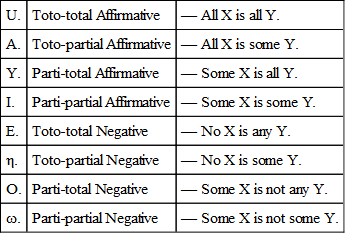 Those Logicians who explicitly quantify the predicate obtain, in all, eight forms of proposition according to Quantity and Quality: