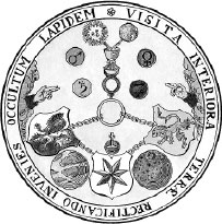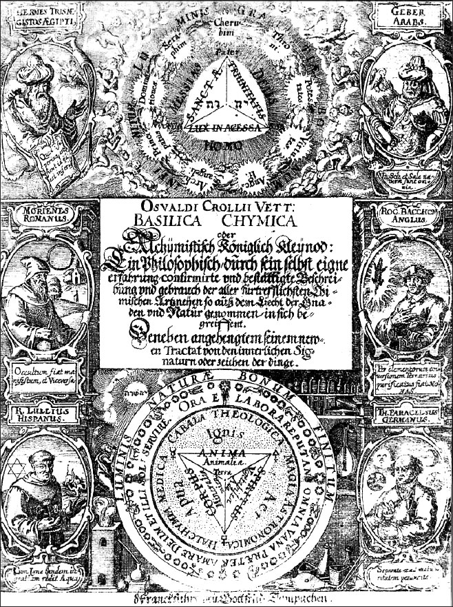 Титульный лист Basilica Chymica (1609), книги ученика Парацельса Освальда Кролла (1560–1609), украшенный портретами шести мастеров алхимии: Гермеса Трисмегиста, Гебера, Мориена, Роджера Бэкона, Раймона Лулля и Парацельса, каждый из портретов сопровожден девизом
