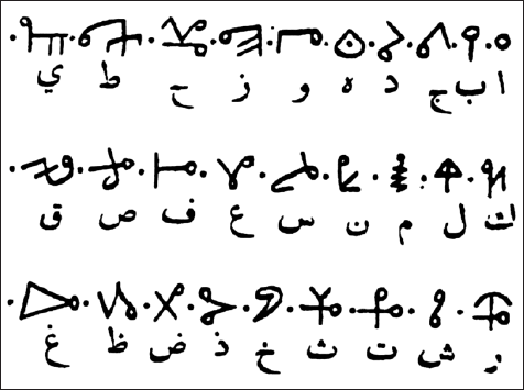 Алфавит Гермеса. Илл. из «Тайных иероглифов и алфавитов» Ибн Вахшии. Под знаками герметического алфавита указаны их соответствия арабским буквам