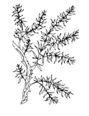 Вечнозеленый кустарник, иглы хвои колючие. Встречается как в сухих сосновых борах, так и в еловых лесах, избыточно увлажненных и даже заболоченных, но пышнее всего развивается при умеренной влажности. В стеблях и хвое можжевельника содержится эфирное масло, в коре – дубильные вещества, в хвое – витамин С. Ягоды можжевельника содержат эфирное масло, включающее до 100 компонентов.
