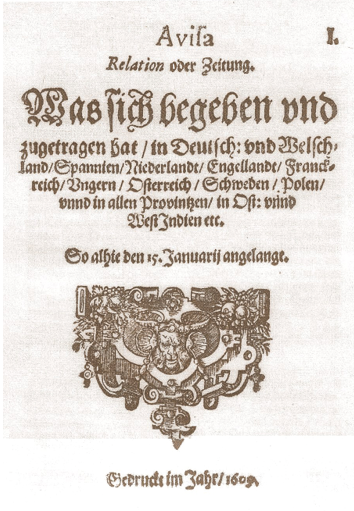 Als die erste regelmäßig erschei-nende Zeitung auf dem Gebiet des heutigen Deutschlands gilt der Avi-so, Relation oder Zeitung. Dies war eine Wochenzeitung, deren erste Nummer am 15. Januar 1609 in Wolfenbüttel erschien. Vgl.: http://de.wikipedia.org/wiki/Geschichte_der_Zeitung (03.02.2014)