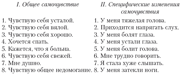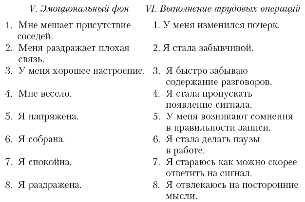В основу составления опросника легло условное выделение шести основных групп симптомов: общего самочувствия, специфических изменений самочувствия со стороны отдельных систем организма, уровня общей активности, изменений мотивации, эмоционального фона деятельности, особенностей выполнения трудовых операций. По отношению к каждому симптому существовала возможность одного из трех типов ответа: «да», «нет», «не знаю».