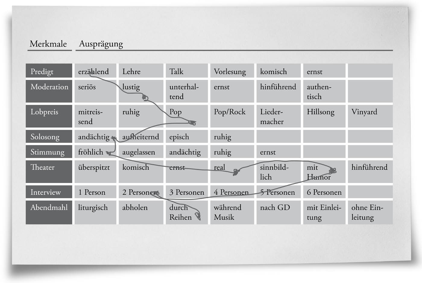 Für eine Fragestellung werden die bestimmenden Merkmale (auch Attribute, Faktoren, Parameter, Dimensionen genannt) festgelegt und untereinander geschrieben. Bei dem Beispiel in der Grafik sind es verschiedene Elemente in einem Gottesdienst. Dann werden alle möglichen Ausprägungen des jeweiligen Merkmals rechts daneben geschrieben. Danach wird aus jeder Zeile eine Ausprägung des Merkmals gewählt, wodurch eine Kombination von Ausprägungen entsteht (siehe Beispiel). Auch innerhalb kreativer Elemente kann so für deren Entwicklung vorgegangen werden.