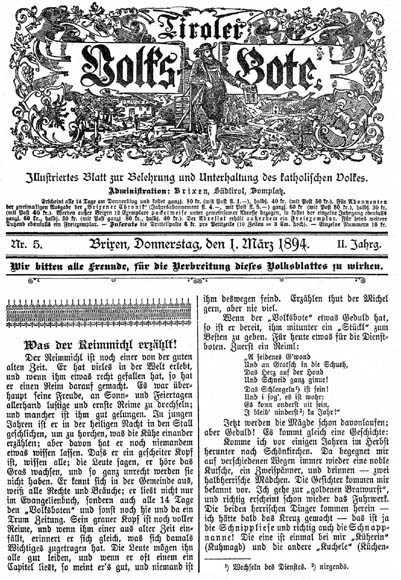 Zeitungskopf des „Tiroler Volksboten“ vom 1. März 1894