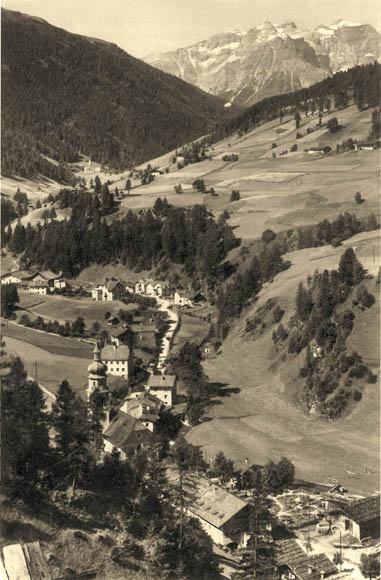 Blick auf das Straßendorf Gries am Brenner. Das Haus hinter dem Kirchturm ist das Widum (Pfarrhof), in dem Reimmichl von 1898 bis 1914 wohnte und arbeitete.