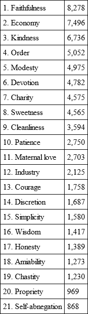Surely, here is food for reflections and comments. Economy, order, and devotion head the list; chastity and self-abnegation figure at the bottom. I should have imagined the last two virtues would have obtained the maximum of votes.