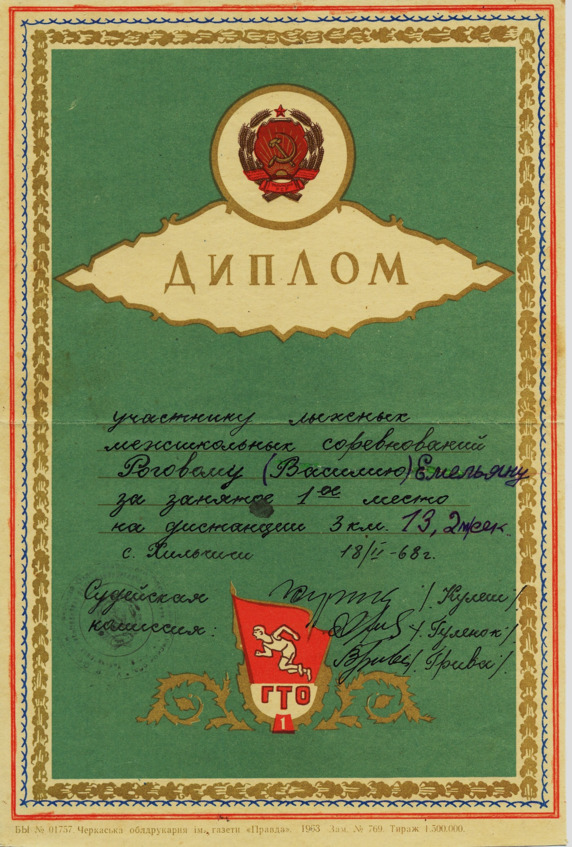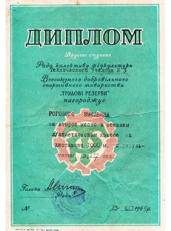 Зима в тот год была необычно снежной, и на уроках физкультуры мы бегали на лыжах. Правда, лыжи были ещё те – тяжелые и громоздкие, из толстого дерева, а крепление надевалось прямо на сапоги или валенки, про лыжные ботинки и пластиковые лыжи тогда еще никто и не слыхивал. Но и на таких я бегал очень быстро, по крайней мере, в школе занимал первые места на всех соревнованиях. В седьмом классе меня послали на первенство района среди школ, где я стал победителем на дистанции три километра. Это была моя первая грамота в спорте, она хранится у меня до сих пор как символ начала моей спортивной карьеры.