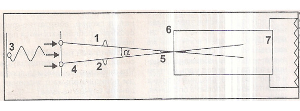 Installation for detecting hidden light. 1,2 – antiphase rays 3. source of coherent rays (laser) 4. phase shift device (diffraction grating) 5. beginning of the «black zone» 6. screen (foil) 7. light-sensitive material («Konica», 400 units).