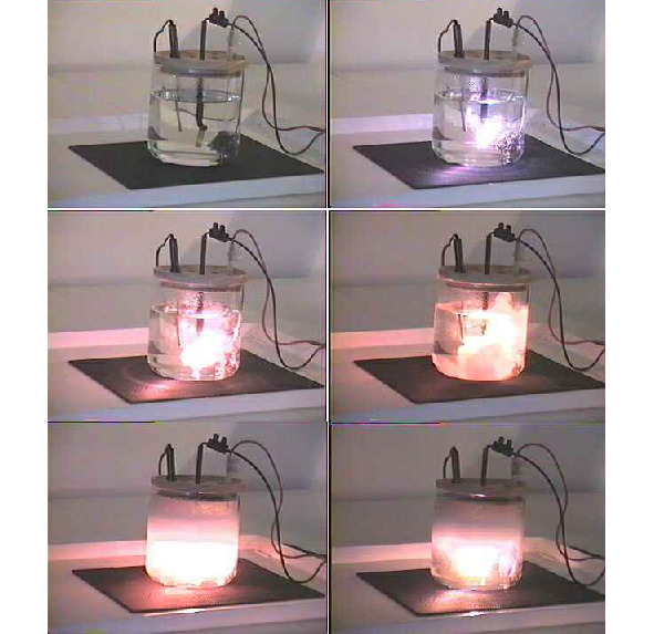 In experiments with electrolytic cells, much is unclear. Either it is electrons that give their own energy, or water ions. Maybe the grains of sand themselves, sticking together, throw energy into space. What does knowledge of the process give us? For example, the fact that the battery bank, one of several, located at the anode (plus) heats up above the rest.