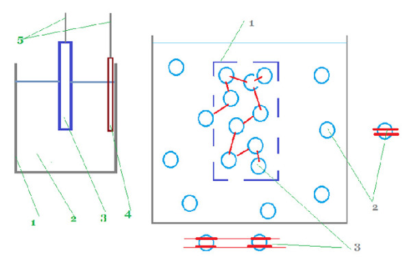 On the left is a diagram of the experiments of Fleischmann and Pons. 1.the walls of the vessel, 2.deuterium (heavy) water, 3.palladium cathode, 4.anode (positive electrode), 5.electric power supply Right. A possible explanation for the cold fusion experiments on the right. 1. Schematic representation of an electrode – a porous vessel that absorbs microparticles, 2. Water molecules outside the cathode. A pictorial image of a microparticle with two active levels is presented. 3. Water molecules having the same levels react and generate a cascade of resonant quanta. Heat is released without nuclear fusion. Heavy water can be replaced with tap water. Palladium is replaceable with any granular media. A variant of the addition to the reactor is the adjacent mirror plates of the resonator.
