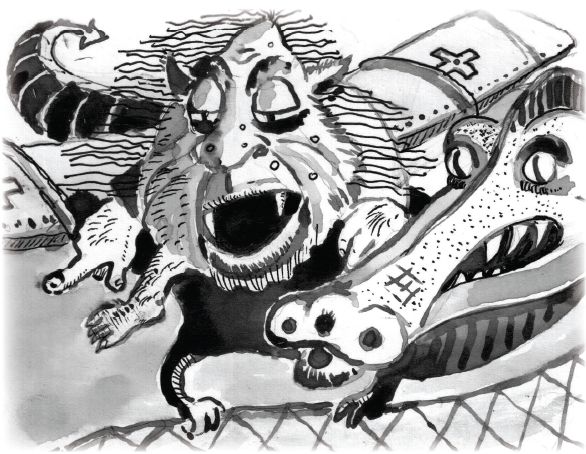 И наконец случилось страшное: оба дракона с жуткими завываниями настигли беглеца и точно над его головой разжали лапы. На Балду упала тяжёлая сеть из стальных колец и спутала его по ногам и рукам. И пока несчастный барахтался, силясь достать брелок с мечом-кладенцом, чтобы разрубить путы, Змеи и Вий огромными тушами навалились на шпиона и крепко прижали к сырой земле. Вий сорвал с Васькиной головы шапку-невидимку, и несостоявшийся герой понял – сопротивление бесполезно. Он очутился-таки в полоне у Царя Кощея.