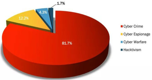 Киберпространство считается областью, которую стоит исследовать и исследовать после земли, моря и воздуха [8]. Это происходит главным образом из-за спорадического роста киберпреступлений и киберпреступников [9]. Рост киберпреступности был вызван развитием технологий и Интернета. Согласно исх. [10]; прогнозируется, что к 2021 году глобальный ущерб от киберпреступности будет стоить 6 триллионов долларов. Однако в период с 2016 по 2018 год это преступление было наиболее зарегистрированным [11]. График и статистика информационной безопасности показывают, что киберпреступность является основной причиной атак, на долю которых приходится 81,7%, как показано на рисунке 1.