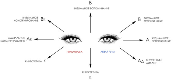 Взгляд направлен влево – аудиальное вспоминание (А). По сути, это звуковая память. Мы можем вспоминать: музыку, голос, звук и т. д.