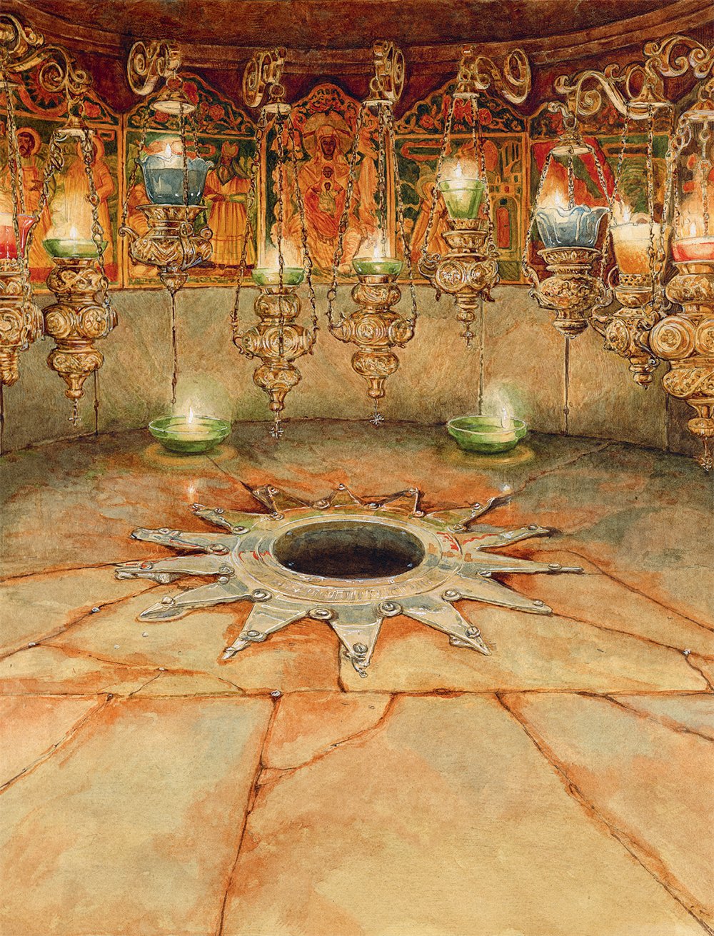 Здесь изображен грот базилики Рождества Христова в Вифлееме, удивительное место, где началась «величайшая история в мире». Сегодня из-за украшений и множества религиозных предметов, которые наполняли это место на протяжении тысячелетий, трудно представить, что именно здесь родился Иисус.