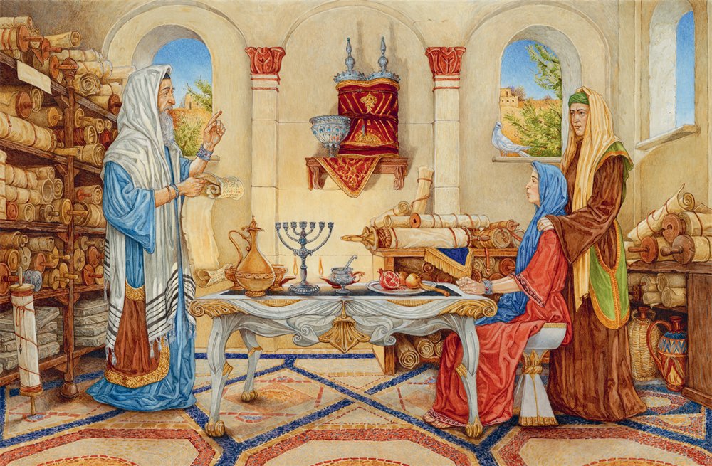 Это родители Марии, наставляющие Ее в Священном Писании. Если задуматься о причинах, почему Бог избрал Марию, стоит обратить внимание на то, что родители Марии намеренно учили Ее развивать духовную чувствительность, любить Божье Слово и быть готовой к послушанию Богу, какими бы ни были Его воля и Его планы, относительно Ее жизни.
