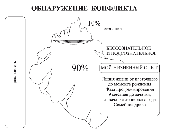 На рисунке показана аналогия с айсбергом, однако вы обнаружите, что 90 % нашего осознавания находится не только под водой, но и затемнено.