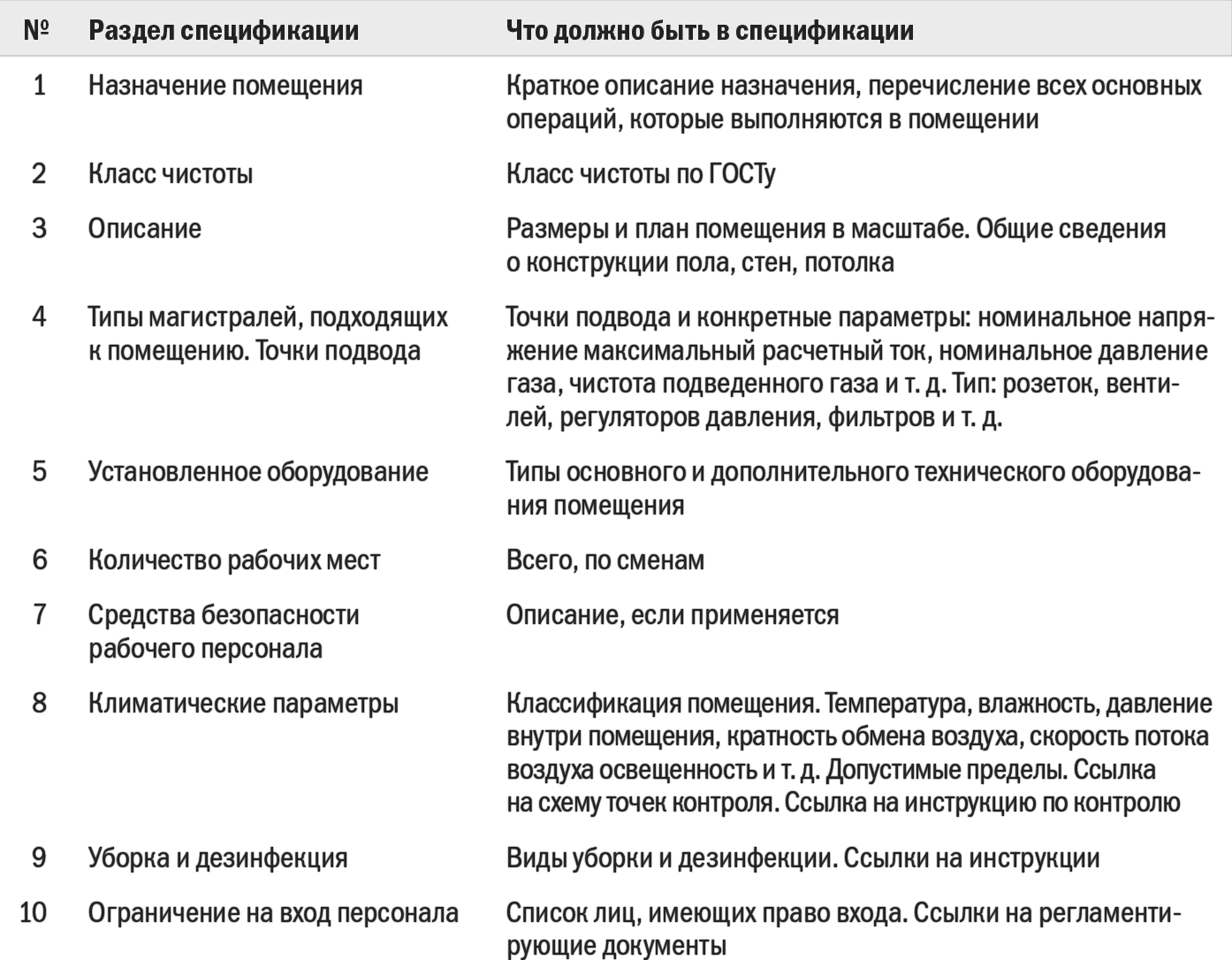 Таблица 1.2.2. Структура спецификации на производственные помещения