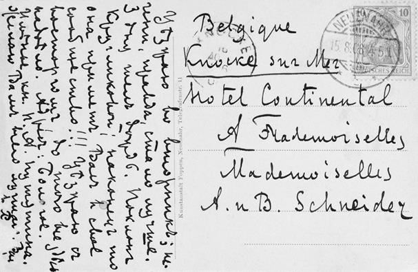 Лицевая и оборотная стороны почтовой открытки, посланной Н.К.Рерихом сестрам А.П. и В.П. Шнейдер 2/15 августа 1908 г. с курорта Бад-Нойенар
