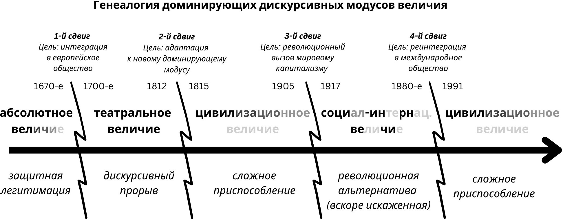 Серая шкала обозначает стабильность и стройность доминирующего дискурсивного модуса величия от очень стабильного и стройного (черный цвет) до оспариваемого (серый цвет) или искаженного (меняющийся цвет). Если модус обозначается как оспариваемый, это значит, что государство в общем принимает семантику и рамки этого модуса как легитимные, но, сталкиваясь с неполным признанием, все чаще опирается на альтернативные модусы величия, чтобы преодолеть комплекс неполноценности. Если модус обозначается как искаженный, это значит, что в официальном дискурсе модус сохраняет свою монополию, но либо его изначальная семантика искажается из‑за внесения в нее инородных смыслов, либо акторы не воспринимают семантику этого модуса всерьез.