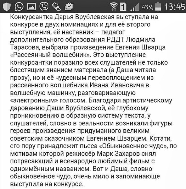 «А как человек, прожив чуть больше тринадцати лет, может сейчас проявлять свой творческий потенциал? Занятия в различных креативных студиях? Да, это все уже есть. Но есть и нечто удивительное – собственная поэзия! Почему удивительное? Да потому, что в таком возрасте у человека еще не может быть огромного жизненного опыта. У человека, вообще, собственное Эго проявляется только на третьем году жизни. В глубине энергетического облака сознания формируется собственное Я, как центр своей маленькой Вселенной. И в нем, в этом облаке, уже существуют загадочные и неведомые нам силы притяжения, взаимодействуя с внешним тонким и физическим мирами. Сознание-то не внутри нас, а мы на самом деле, наше Я, находится внутри сознания. И наше энергетическое облако является частью информационного поля всей Вселенной. Иначе, откуда могут взяться такие глубокие мысли и такие стихотворные формы как у Даши?» Ниже приведу некоторые ее стихи.