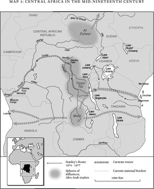 In 1870 the villagers of Bandio noticed none of this. But the Zanzibar traders possessed excellent firearms and so they themselves moved farther and farther into the interior, farther than the Europeans to the west ever had. Some of them were pure Arabs, others were of mixed African blood. Often they included African converts to Islam, whom we refer to as Afro-Arab or Swahilo-Arab traders; in the nineteenth century, however, they were called les arabisés. Swahili, a Bantu language with many Arabic loan words, spread all over Eastern Africa. Starting at Zanzibar and the town of Bagamoyo on the coast, huge caravans began heading inland from 1850 on, until they reached the shores of Lake Tanganyika, eight hundred kilometers to the west. The settlement of Ujiji, where Stanley would “find” Livingstone in 1871, became a major trading post. From the lake’s far shore the caravans moved even farther inland, into the area now known as Congo. As with the trading empire of al-Zubayr, one saw spheres of commercial influence solidify into political entities. In southeastern Katanga, Msiri, a trader from the African east coast, took over an existing realm: the ancient, but by-then mordant Lunda Empire. From 1856 to 1891 he was lord and master over this region rich in copper and controlled all trade routes to the east. His interests, at first purely commercial, in this way took on political form.