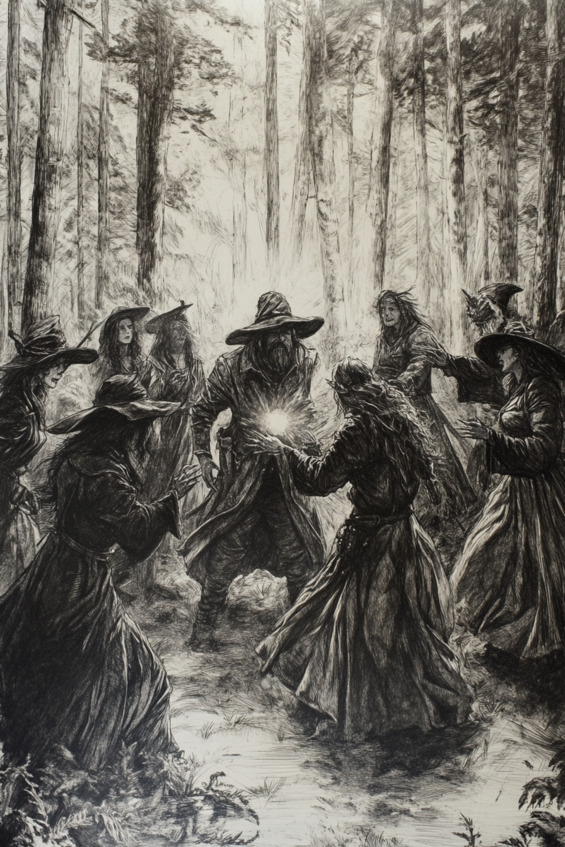 Внезапно, через лес донёсся топот множества ног и звон металла. Это был Реем и его охотники на ведьм, вооружённые до зубов и полные решимости уничтожить всех магов на своём пути. Ведьмы подняли свои жезлы и начали произносить защитные заклинания, готовясь к обороне.