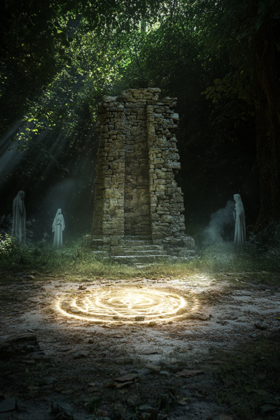 После долгого пути через лес, Кейт вышла на небольшую поляну. В центре поляны стоял старинный каменный алтарь, окружённый руинами древних зданий. Свет, который она видела, исходил от магического круга, начертанного на земле возле алтаря.
