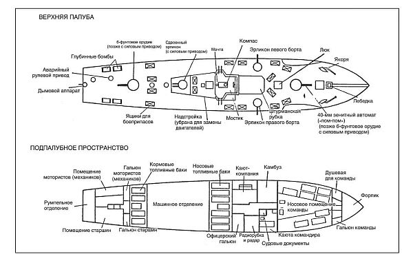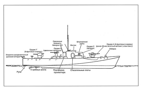 658-я имела довольно сильное вооружение для небольшого корабля. На баке имелась 40-мм автоматическая пушка «пом-пом» во вращающейся башне, по обеим сторонам от штурманской рубки были установлены спаренные 0,5-дюймовые пулеметы Викерса, на крыльях мостика – спаренные 0,303-дюймовые пулеметы Викерса, над машинным отделением – 20-мм эрликон и еще один пулемет 0,303-дм в корме. Такое количество орудий предполагало наличие многочисленной команды для формирования орудийных расчетов. На 658-й было три офицера и тридцать старшин и рядовых. Да и тех надо было как-то суметь разместить в очень ограниченном пространстве под палубой.