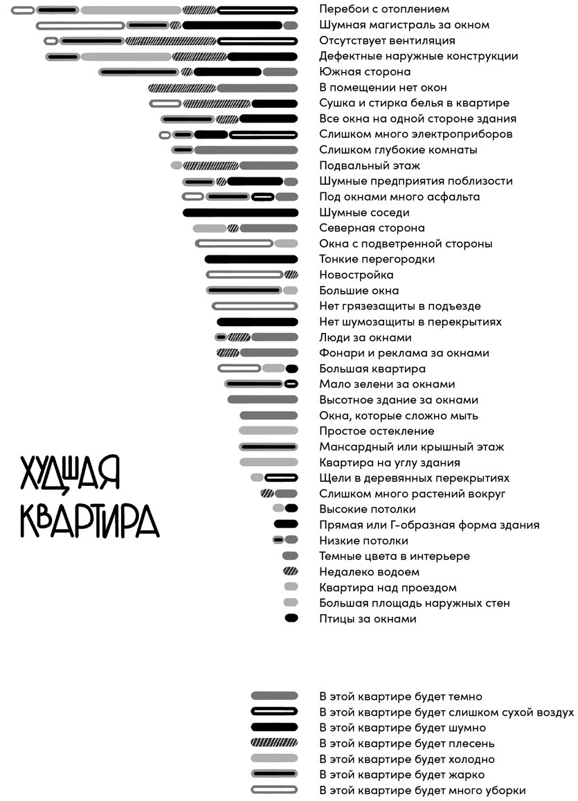 В исходном состоянии все квартиры на самом деле друг на друга похожи. У них частенько одни и те же недостатки и примерно одинаковая форма внутреннего пространства: прямоугольная. Обитатели этих параллелепипедов тоже во многом сходятся: большинство хотят шуметь и смотреть на лес из окна. Ниже я оставлю памятку, в которую стоит заглянуть перед подписанием договора покупки или аренды. Я назвала этот чек-лист «Худшая квартира» – это собранный мною список самых частых проблем, о которых упоминают люди, говорящие, что их что-то в квартире раздражает. Важно тем не менее помнить, что фатальных ошибок в выборе квартиры не бывает. Даже на лестничной клетке реально обустроить покрывающие все ваши нужды апартаменты. Исключение составляют полутораметровые квартиры-гробы в Гонконге – с этим я пока не знаю, что делать.