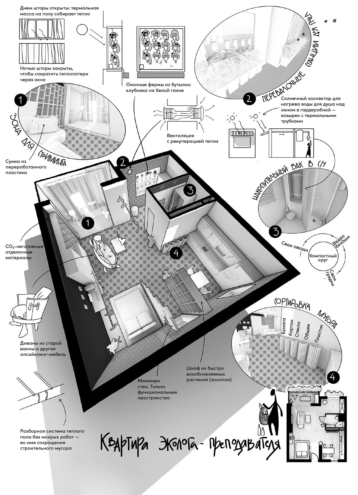 Так было всегда. Но сейчас я предчувствую особенный рубеж переосмысления сути жилого пространства. Это случится с рынком типовой недвижимости, многие десятилетия деградировавшей до спальных коробок, как раз в тот момент, когда программистами найдены и уже почти популяризированы механизмы, позволяющие штамповать хорошо продаваемые микрорайоны одним нажатием кнопки. В создании жилья больше недостаточно учитывать эргономику и микроклимат. Городские квартиры перестают быть местом для сна и хранения вещей. Они уже давно превратились в площадки для развития, обучения и зарабатывания денег. Да вот только они физически для этого не приспособлены: ни старые здания, ни те, что находятся только на этапе строительства. В них нельзя выращивать еду, производить энергию, фильтровать воду или перерабатывать отходы. В них невозможно предаваться любовным ласкам без страха потревожить соседей. И, разумеется, они не приспособлены для продуктивной работы и творчества – именно поэтому и появилась эта книга. Культура проектирования продолжает игнорировать тот факт, что около 40﹪ всех рабочих мест генерируется за счет малого бизнеса, около половины которого осуществляется из дома. И дело не в пандемии, растущем количестве вынужденных переселенцев, банкротстве компаний или растущей безработице. Нет, это просто эволюционное смещение парадигмы. Дом – это источник наших ресурсов, и у большинства он пока немного перекрыт.